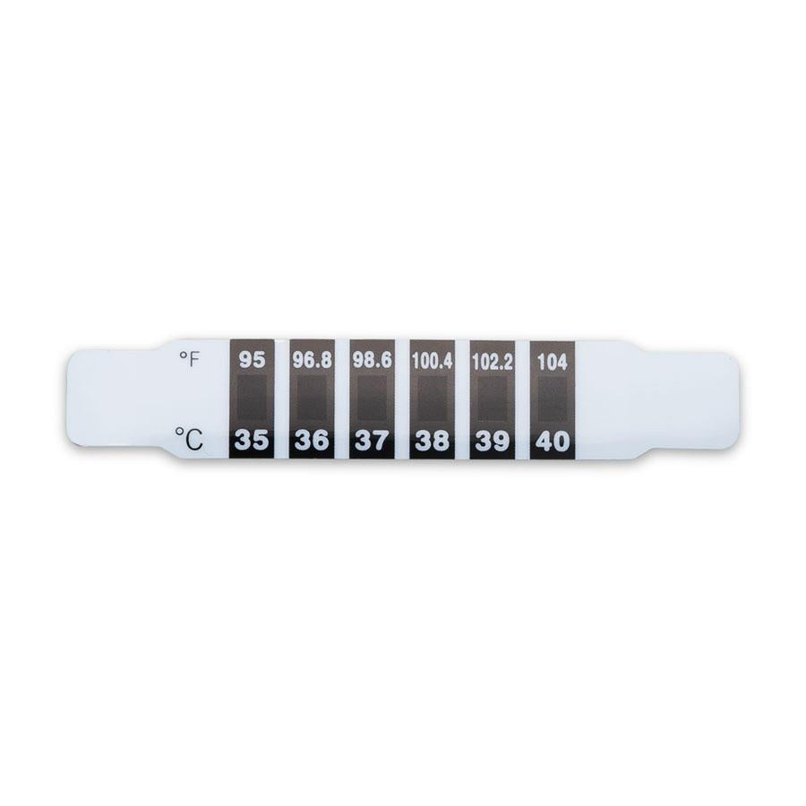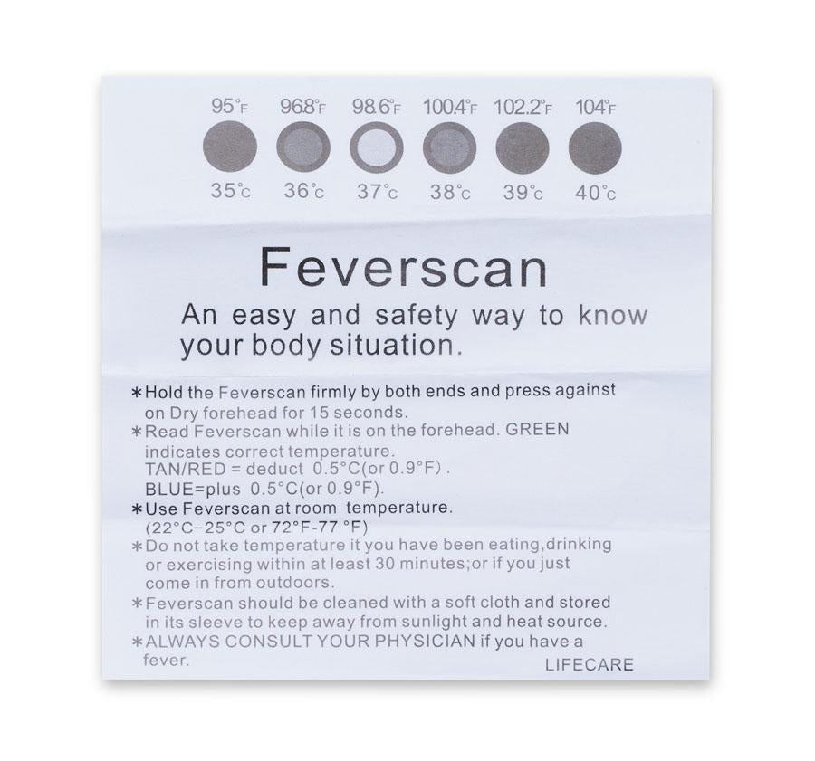 A fever scan strip suitable for placing on a person's forehead, 9cm x 1.5cm