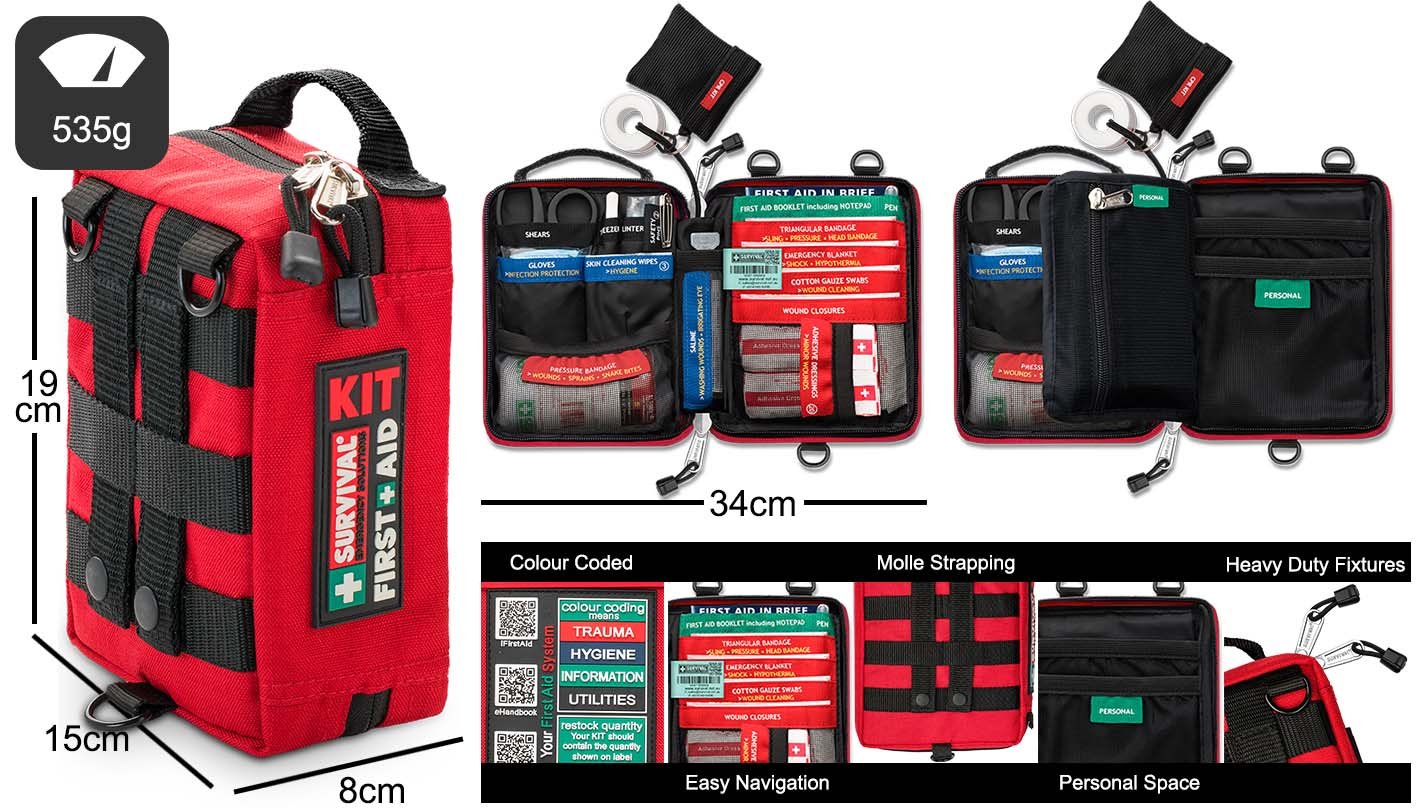 **The new and improved design for the SURVIVAL Handy First Aid KIT also features the sophisticated MOLLE system for tailored attachment, new shoulder straps and redesigned zips that are sturdier than ever before, with an extra layer of material on the outside that protects both zips and the KIT’s contents from the elements.**
